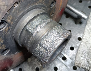 - Восстановление посадки под подшипник на чугунном корпусе бортовой передачи Unimog . До ремонта, во время ремонта, результат.