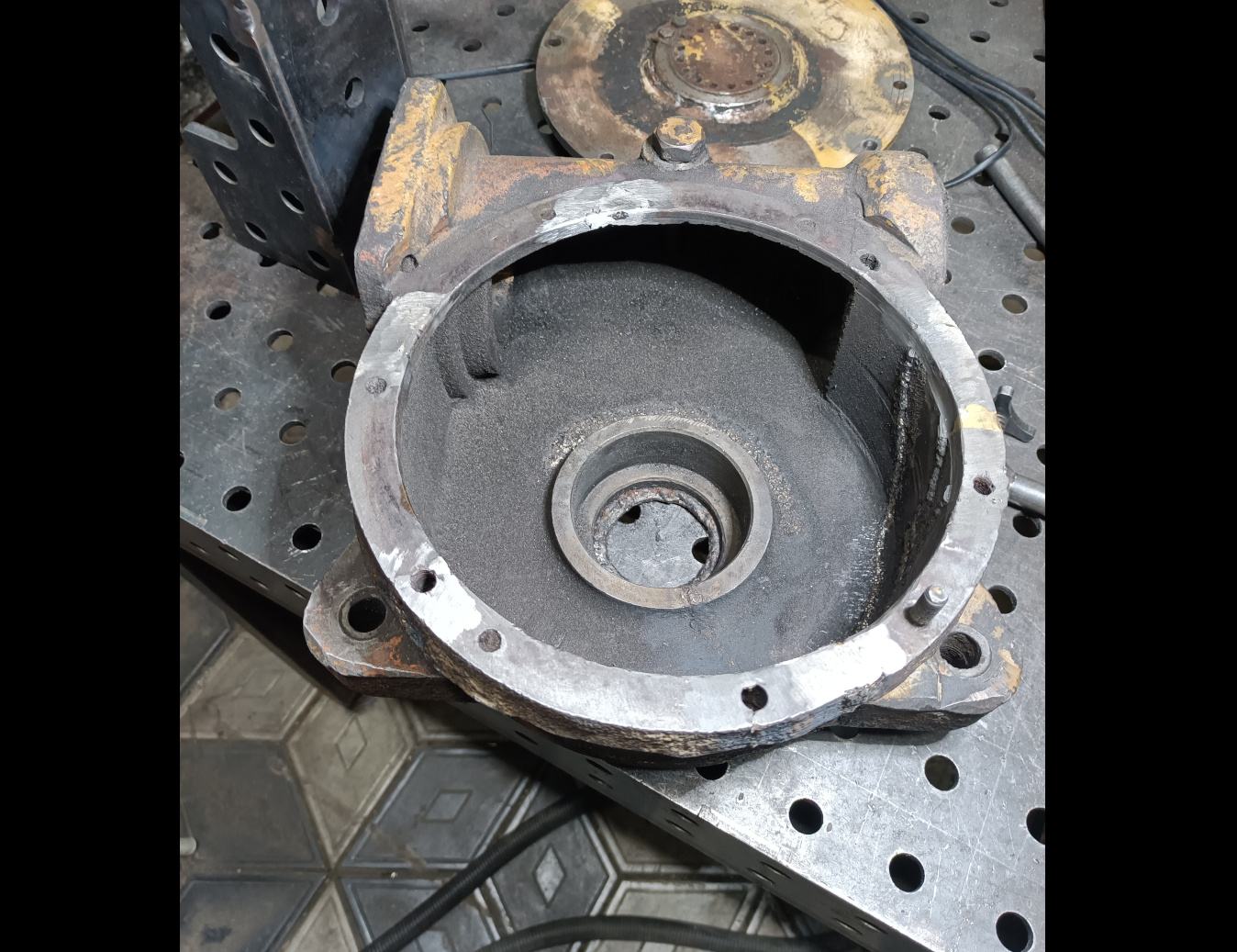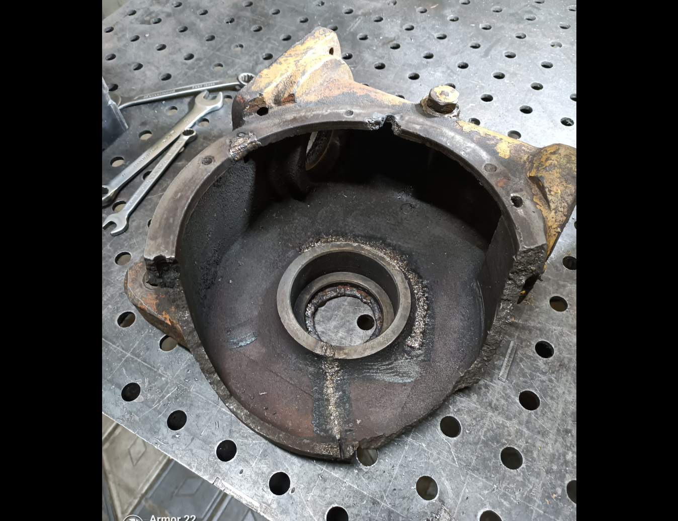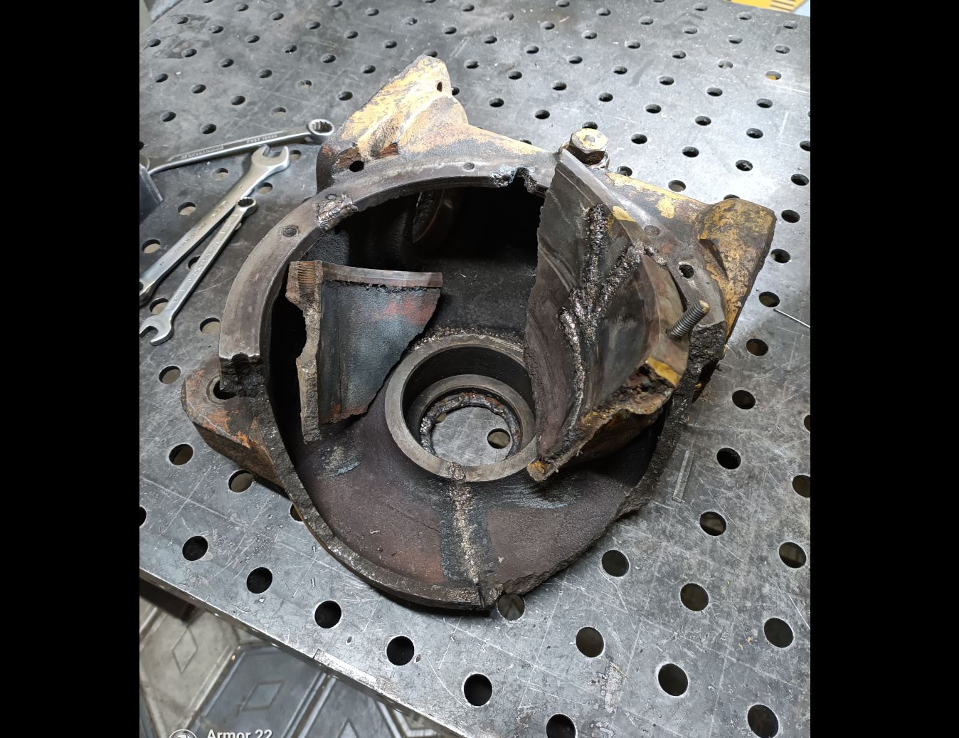 - Восстановление разрушенного чугунного корпуса поворотного редуктора автовышки. До и после ремонта.